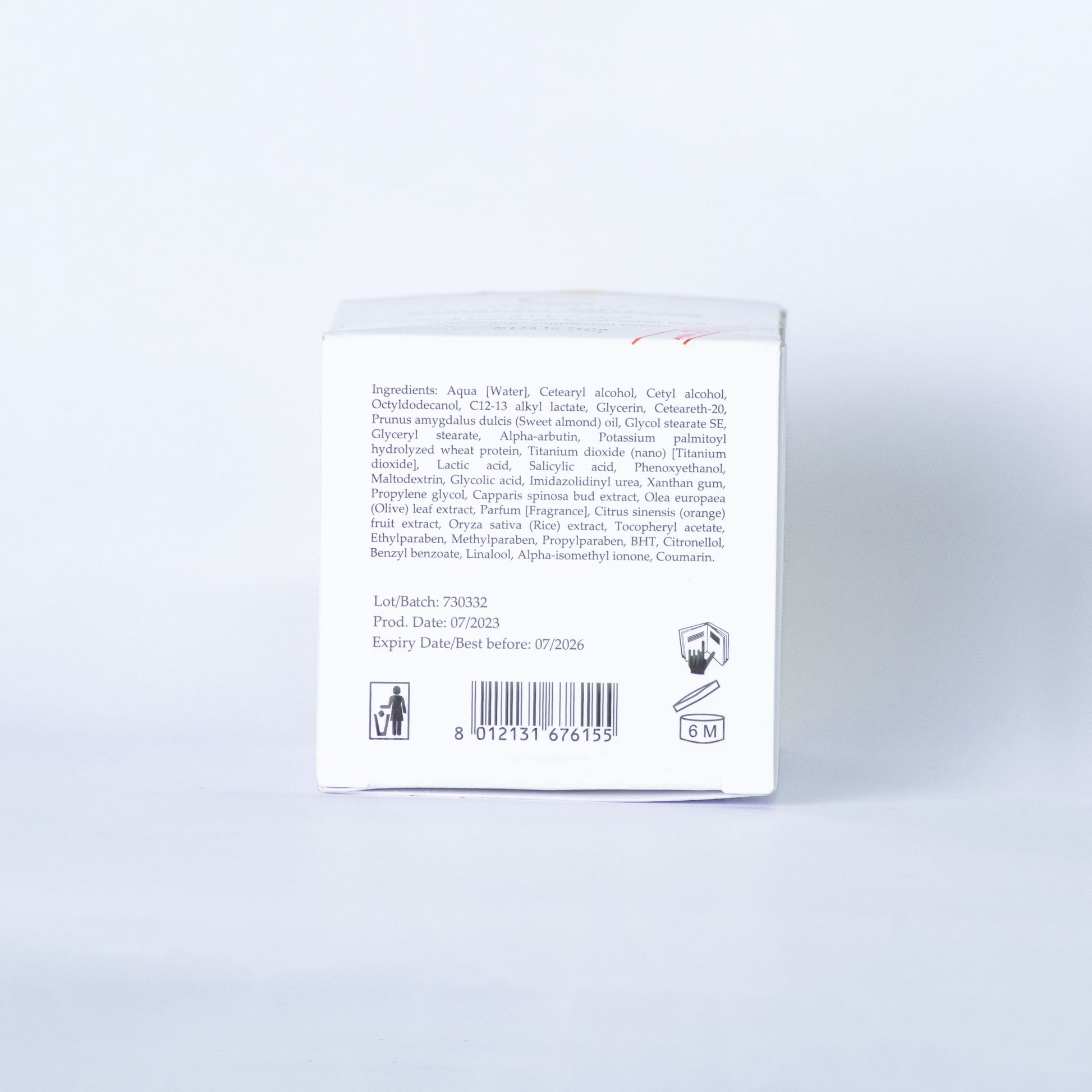 Also contains: Arbutin, Prunus dulcis (Almond Oil), Skin Light (Skin Moon) Complex, Glyceryl Stearate (SE), Glycerine, Hydroxyacids, Glycolic Acid, Salicylic Acid, Lactic Acid and Lactates, Vitamin E, Titanium Dioxide.
